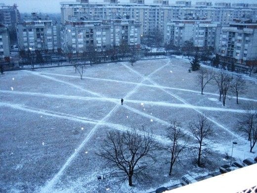 In 1967, long before the term desire path was popularised, Richard Long, a 22-year-old student, walked in a straight line in a grassy field, there and back, until a path appeared. He then photographed his ephemeral sculpture, thus creating A Line Made By Walking. That photograph, and indeed the act itself behind it, became a seminal piece in the history of land art and conceptual art. The line was a record of his desire, time, persistence, regularity, and agenda. “My work has become a simple metaphor of life. A figure walking down his road, making his mark. It is an affirmation of my human scale and senses.”